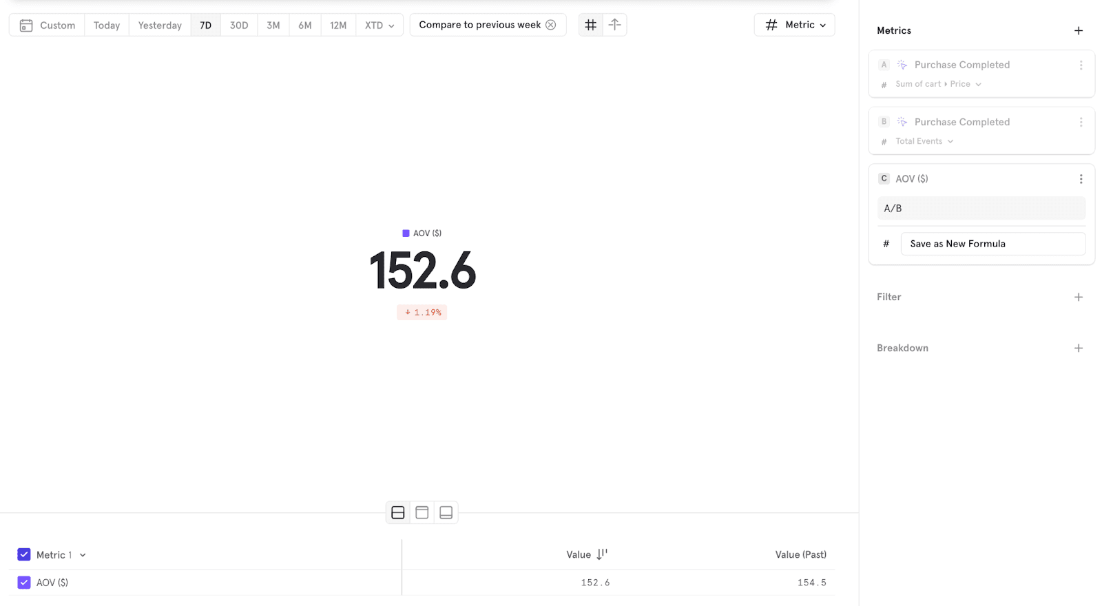 Average Order Value (AOV): Calculated as Total Revenue over the Total Number of Purchases. See this example in our demo project.